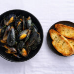 Şefin özel şarap sosuyla hazırlanan 20 adet midye, tereyağlı sarımsaklı ekmek eşliğinde servis edilir.